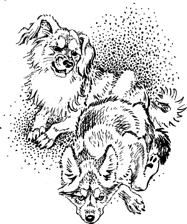 Собаки скандалятЯ каждый вечер ходил со зверями на прогулку. Плишка была приучена бежать рядом с правой ногой, а Манефа сидела у меня на плече. Улицы были около моей квартиры пустынные и, правду сказать, места воровские – народу попадалось мало, и некому было пальцем показывать, что вот идет взрослый мужчина с кошкой на плече. И вот я решил теперь пойти гулять вчетвером – взять с собой волка. Я купил ему ошейник, цепочку и пошел вечером по улице: волчонок ковылял с левой стороны, но его приходилось подергивать за цепочку, чтоб он шел рядом. Думал, нас никто не заметит. Но вышло не так: нас заметили и подняли скандал. Только не люди, а собаки.