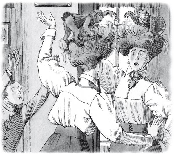 Дама отняла зеркальце, зажала его в руке. А Яшке хочется зеркало получить. Дама погладила небрежно Яшку перчаткой и потихоньку спихивает его с колен. Вот Яшка и решил подольститься к даме. Прыг ей на плечо. Ухватился за кружева задними лапками и взялся за причёску. Раскопал завитки и стал искать. Дама покраснела.