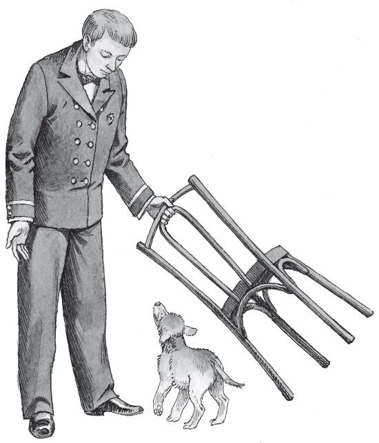 Когда я ушёл в школу, я привязал Яшку к дверям, к ручке. На этот раз обвязал его вокруг пояса верёвкой, чтобы уж не мог сорваться. Когда я пришёл домой, то из прихожей увидал, чем Яшка занимается. Он висел на дверной ручке и катался на дверях, как на карусели. Оттолкнётся от косяка и едет до стены. Пихнёт ножкой в стену и едет назад.