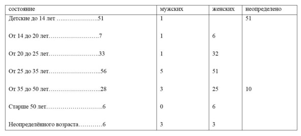 Соотношение человеческих останков и их число, по половому и возрастному признакам, представлено в таблице: