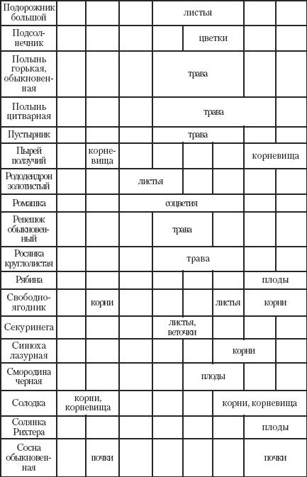 Перед тем как приступить к сбору лекарственных растений, необходимо ознакомиться с ними и, конечно же, научиться отличать полезные целебные растения от похожих на них малоценных или даже ядовитых видов. Особенно важно правильно определить время сбора растений, поскольку оно зависит от местных метеорологических и почвенных условий и может быть неодинаковым для разных районов страны. На практике сроки сбора уточняются по внешним признакам, установленным в основном опытным путем с учетом того, что в данный момент процент содержания лекарственных веществ в растениях должен быть самым высоким. Ниже будет приведен календарь сбора лекарственных растений.