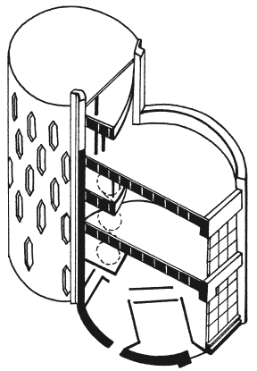 Наиболее ярко идеи конструктивизма представлены в доме, который построил для себя в Москве архитектор К. С. Мельников. Это строение даже в наше время выглядит ультрасовременным. Небольшой жилой дом составлен из 2 цилиндров, слегка врезанных друг в друга. Здание включает мастерскую и жилые помещения. Южный фасад, подставляющий солнцу высокий витраж остекления, имеет два этажа, в северном цилиндре на третьем этаже расположена мастерская. Этажи южного и северного объемов расположены в разных уровнях так, что каждый марш винтовой лестницы выходит на один из уровней, а перекрытия второго и третьего этажей продолжаются в виде балконов в смежные помещения. Множество окон в виде вертикальных шестиугольников обеспечивают помещения достаточным количеством света в любое время дня, поскольку расположены по кругу (рис. 2).