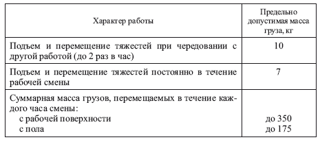 Максимальная масса груза, эпизодически поднимаемого (опускаемого, перемещаемого) вручную, или прилагаемых усилий не должна превышать 2,5 кг. При частых (но не более 100 раз в час до 12 недель беременности и не более 50 раз в час при большем сроке) подъемах и перемещениях груза или прилагаемых усилий их величина не должна превышать 1,2 кг.