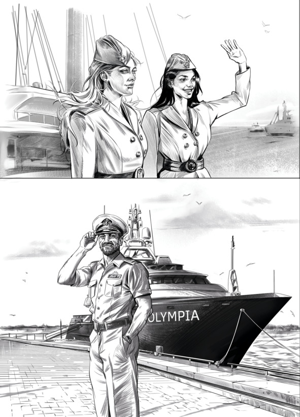 Это была самая большая и красивая яхта в порту – так им показалось в ту минуту. У трапа, на фоне золотистых букв Olympia на борту, стоял капитан – тот самый, с которым Жанна познакомилась в ресторане в Москве, только он выглядел ещё элегантнее и как-то даже задиристей, что ли. На нём были форменная белая рубашка с коротким рукавом и золотистой отделкой и белые брюки с идеальной стрелкой, дополненные тёмно-синим ремнём с сияющей пряжкой. И конечно же, капитанская фуражка! Белая, с тёмно-синим околышем в цвет ремня, с золотым плетёным ремешком и такой же золотой кокардой. А золотистое шитьё на козырьке в виде лавровых ветвей не давало его владельцу ни единого шанса остаться незамеченным даже на самом грандиозном параде любой флотилии мира!