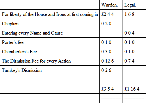 THINGS got so bad that Parliament ordered a Committee to inquire into it, and they began their sitting in Feb. 25, 1729. But, previously, the prisoners had petitioned the Lord Chief Justice and other justices without effect, and those petitions with Huggins' (who was the Warden) replies were published in a folio pamphlet, which contains much information.110 The first petition was in 1723, and it was mainly addressed to the extortions of the Master, the sixth Article alledging that the fees exacted by the Warden were in excess of those settled by Law, Nov. 14, 1693 – instanced as follows: