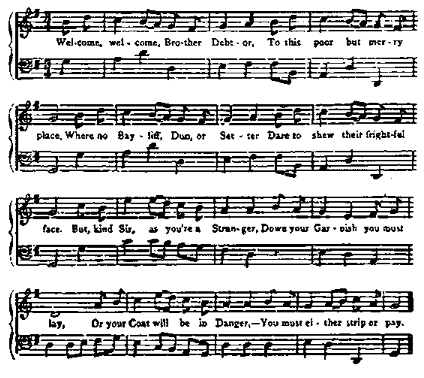 "Close by the Borders of a slimy Flood,Which now in secret rumbles thro' the Mud;(Tho' heretofore it roll'd expos'd to Light,Obnoxious to th' offended City's Sight.)114"Twin Arches now the Sable Stream encloseUpon whose Basis late a Fabrick rose;}In whose extended oblong Boundaries,Are Shops and Sheds, and Stalls of all Degrees,For Fruit, Meat, Herbage, Trinkets, Pork and PeasA prudent City Scheme, and kindly meant;The Town's oblig'd, their Worships touch the Rent."Near this commodious Market's miry Verge,The Prince of Prisons Stands, compact and large;When, by the Jigger's115 more than magick Charm,Kept from the Pow'r of doing Good – or Harm,Relenting Captives only ruminateMisconduct past, and curse their present State;Tho' sorely griev'd, few are so void of Grace,As not to wear a seeming chearful Face:In Drinks or Sports ungrateful Thoughts must die,For who can bear Heart-wounding Calumny?Therefore Cabals engage of various Sorts,To walk, to drink, or play at different Sports:Here, on the oblong Table's verdant Plain,The ivory Ball bounds, and rebounds again; 116There, at Backgammon, two sit tete a tete,And curse alternately their Adverse Fate;These are at Cribbage, those at Whist engag'dAnd, as they lose, by turns become enrag'd:Some of more sedentary Temper, readChance-medley Books, which duller Dullness breed;Or Politicks in Coffee-Room, some poreThe Papers and Advertisements thrice o'er:Warm'd with the Alderman, 117 some set up late,To fix th' Insolvent Bill, and Nation's Fate;Hence, knotty Points at different Tables rise,And either Party's wond'rous, wond'rous wise:Some of low Taste, ring Hand Bells, direful Noise!And interrupt their Fellows' harmless Joys;Disputes more noisy now a Quarrel breeds.And Fools on both Sides fall to Loggerheads:Till wearied with persuasive Thumps and Blows,They drink, and Friends, as tho' they ne'er were Foes."Without Distinction, intermix'd is seen,A 'Squire quite dirty, a Mechanick clean:The Spendthrift Heir, who in his Chariot roll'd,All his Possessions gone, Reversions sold,Now mean, as once Profuse, the stupid SotSits by a Runner's Side, 118 and shules 119 a Pot."Some Sots ill-manner'd, drunk, a harmless Fight!Rant noisy thro' the Galleries all Night;For which, if Justice had been done of late,The Pump 120 had been three pretty Masters Fate.With Stomacks empty, and Heads full of CareSome Wretches swill the Pump and walk the Bare; 121}Within whose ample Oval is a Court,Where the more Active and Robust resort,And glowing, exercise a manly Sport(Strong Exercise with mod'rate Food is good,It drives in sprightful Streams the circling Blood;)While these with Rackets strike the flying Ball,Some play at Nine Pins, Wrestlers take a Fall;Beneath a Tent some drink, and some aboveAre slily in their Chambers making Love;Venus and Bacchus each keeps here a Shrine,And many Vot'ries have to Love and Wine."Such the Amusement of this merry Jail,Which you'll not reach, if Friends or Money fail:For e'er its three-fold Gates it will unfold,The destin'd Captive must produce some Gold:Four Guineas, at the least, for diff'rent Fees,Compleats your Habeas, and commands the keys;Which done, and safely in, no more you're led,If you have Cash, you'll find a Friend and Bed;But, that deficient, you'll but Ill betide,Lie in the Hall,122 perhaps, or Common Side.123"But now around you gazing Jiggers124 swarm,To draw your Picture, that's their usual Term;Your Form and Features strictly they survey,Then leave you, (if you can) to run away.}"To them succeeds the Chamberlain, to seeIf you and he are likely to agree;Whether you'll tip,125 or pay your Master's Fee.126Ask him how much? 'Tis one Pound six and eight;And, if you want, he'll not the Twopence bate:When paid, he puts on an important Face,And shews Mount Scoundrel 127 for a charming Place:You stand astonish'd at the darken'd Hole,Sighing, the Lord have Mercy on my Soul!And ask, have you no other Rooms, Sir, pray?Perhaps enquire what Rent too, you're to pay:Entreating that he wou'd a better seek;The Rent (cries gruffly's) – Half a Crown a Week.The Rooms have all a Price, some good, some bad;But pleasant ones at present can't be had:}This Room, in my Opinion's not amiss;Then cross his venal Palm with half a Piece 128He strait accosts you with another Face."Sir you're a Gentleman; – I like you well,But who are such at first, we cannot tell;Tho' your Behaviour speaks you what I thought,And therefore I'll oblige you as I ought:"How your Affairs may stand, I do not know,But here, Sir, Cash does frequently run low.I'll serve you, – don't be lavish, – only mum!Take my Advice, I'll help you to a Chum! 129A Gentleman, Sir, – see, and hear him speak,With him you'll pay but fifteen Pence a Week; 130Yet his Apartment's on the Upper Floor, 131Well furnish'd, clean and nice; who'd wish for more?A Gentleman of Wit and Judgment too!Who knows the Place; 132 what's what, and who is who;My Praise, alas! can't equal his Deserts;In brief, – you'll find him, Sir, a Man of Parts."Thus, while his fav'rite Friend he recommends,He compasses at once their several Ends;The new come Guest is pleas'd, that he should meetSo kind a Chamberlain, a Chum so neat:But, as conversing thus, they nearer come,Behold before his Door, the destin'd Chum."Why stood he there, himself could scarcely tell;But there he had not stood, had Things gone well:}Had one poor Half-penny but blest his Fob,Or, if in Prospect he had seen a Job,H'had strain'ed his Credit for a Dram of Bob,133But now, in pensive Mood, with Head down cast,His Eyes transfix'd as tho' they look'd their last;One Hand his open Bosom lightly held,And one an empty Breeches Pocket fill'd.His Dowlas Shirt no Stock or Cravat bore,And on his Head, no Hat or Wig he wore;But a once black shag Cap, surcharg'd with Sweat;His Collar, here a Hole, and there a Pleat;Both grown alike in Colour, that – alack!This, neither now was White, nor that was Black;But match'd his dirty yellow Beard so true,They form'd a
