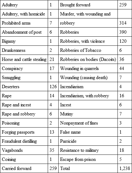 In the city of Manila there was only one conviction for murder in five years. The proportion of the graver offences in the different provinces is nearly the same, except in the island of Negros, where of forty-four criminals, twenty-eight were convicted of murder.