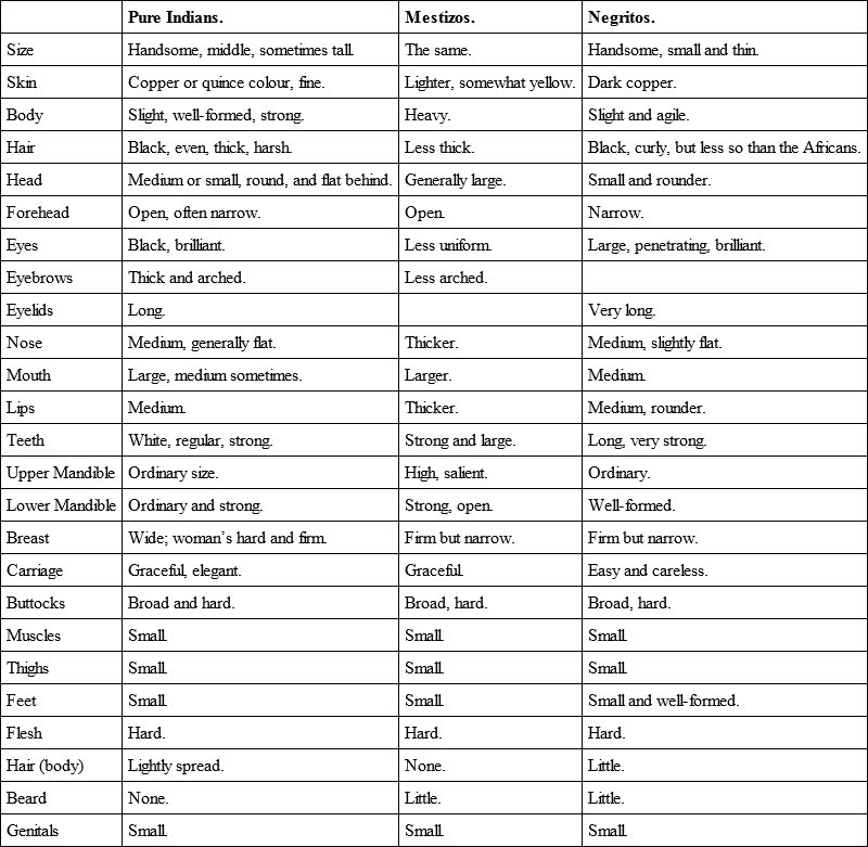 Buzeta gives the following ethnological table, descriptive of the physical characteristics of the various races of the Philippines: —