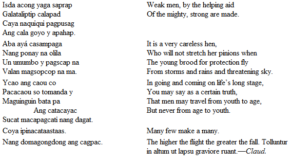 The poetry of the Tagals is in quantity of twelve syllables. They have the Spanish asonante, but words are considered to rhyme if they have the same vowel or the same consonant at a terminal, as thus: —