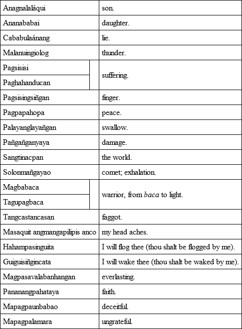 The following may serve as specimens of Tagál polysyllabic words: —