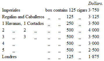 Cheroots (cigars) are manufactured in two forms, – that of the Havana, the smaller end being twisted to a point, – or cut at both ends, the usual Manila form. They are of sundry qualities, as follows: – Largest size, 125 to a box – 1st Regalias, 1st Caballeros and Londres; second size, 250 to a box – 2nd Regalias and 1st Cortados, 2nd Caballeros, 1st Havanas (ordinary size, and such as are more commonly used, Nos. 2 and 3 being those in most demand); 500 to a box – Nos. 2, 3, 4, and 5 Havanas, 2 and 3 Cortados. Besides these, enormous quantities of paper cigars (cigarillos) are consumed by the natives. They are sold in packets of twenty-five, at 5 cuartes; thirty, at 5⅓ cuartes; thirty-six, at 5 5⁄7 cuartes.
