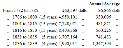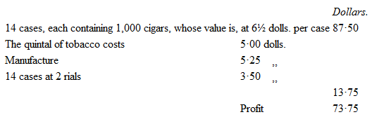 In 1810 the deliveries were 50,000 bales (of two arrobas), of which Gapan furnished 47,000, and Cagayan 2,000. In 1841 Cagayan furnished 170,000 bales; Gapan, 84,000; and New Biscay, 34,000. But the produce is enormously increased; and so large is the native consumption, of which a large proportion pays no duty, that it would not be easy to make even an approximative estimate of the extent and value of the whole tobacco harvest. Where the fiscal authorities are so scattered and so corrupt; – where communications are so imperfect and sometimes wholly interrupted; – where large tracts of territory are in the possession of tribes unsubdued or in a state of imperfect subjection; – where even among the more civilized Indians the rights of property are rudely defined, and civil authority imperfectly maintained; – where smuggling, though it may be attended with some risk, is scarcely deemed by anybody an offence, and the very highest functionaries themselves smoke and offer to their guests contraband cigars, on account of their superior quality, – it may well be supposed that lax laws, lax morals and lax practices, harmonize with each other, and that such a state of things as exists in the Philippines must be the necessary, the inevitable result. It is sufficient to look at the cost of the raw material and the value of the manufactured article to perceive what an enormous margin of profit there exists. A quintal of tobacco will produce —