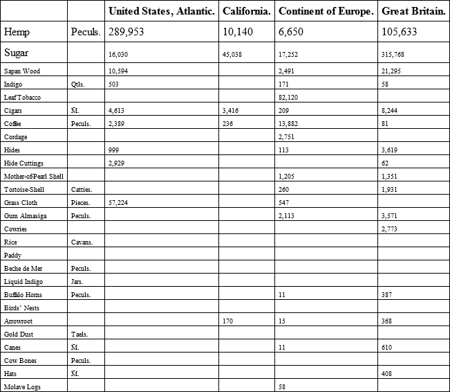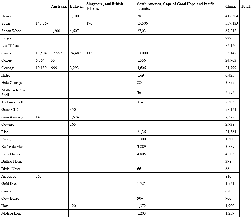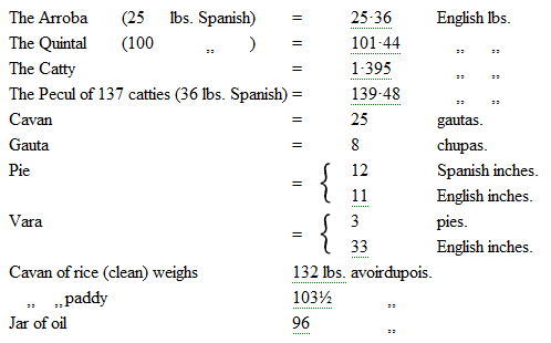 By a royal decree, dated 31st March, 1855, three additional ports were opened to foreign trade – Zamboanga (Mindanao), Iloilo (Panay), and Sual (Luzon). The results have not responded to anticipations. One reason is obvious – custom-house officers, custom-house restrictions, custom-house vexations accompanied the seemingly liberal legislation. These are sufficient to check, if not to crush, the growth of intercourse. I doubt if in either of the new ports the custom-house receipts cover the costs of collection. The experiment should have been a free-trade experiment, but the jealousies and fears of the capital were probably influential. It ought not to have been forgotten that the new ports, charged with all the burdens which pressed upon Manila, offered none of its facilities, the creation of many generations – wharves and warehouses, accomplished merchants, capital, foreign settlers, assured consumption of imports and supply of exports; these counterbalanced the cost of conveyance of goods to or from the capital, while, on the other hand, the introduction of a custom-house has prejudiced the trade which previously existed – as, for example, the call of whalers at Zamboanga, unwilling to submit to the fiscal exactions now introduced. But if every port in the Philippines were made free from custom-houses a great impulse would be given to industry, commerce and shipping; the loss to the treasury would be inconsiderable, for the net proceeds of the customs duties is very insignificant, while other sources of revenue would be undoubtedly increased by the impulse given to the general prosperity. De Mas states that the extension of the trade of Cuba from the Havana to other ports led to an augmentation in its value from 2,000,000 to 30,000,000 dollars.
