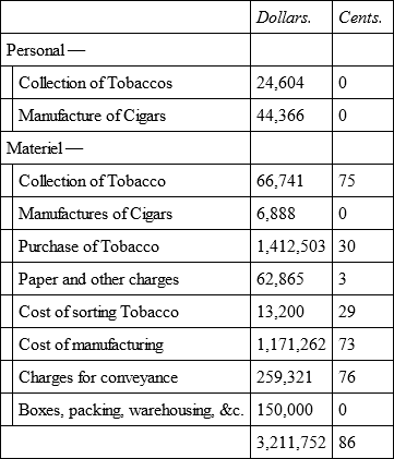 So that the net rendering of this most valuable production is only 1,886,042·14 dollars, or 37 per cent. upon the gross amount, 63 per cent. being expended on the production of the tobacco and manufacture of the cigars. I am of opinion that from 4,000,000 to 5,000,000 dollars might be realized with immense benefit to the public by a tax upon cultivation, or the imposition of a simple export duty, or by a union of both. Production would thus be largely extended, prices moderated to the consumer and the net revenue probably more than doubled.