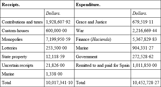 Thus about one-tenth of the gross revenue is received by the mother country in the following shapes: – Salaries of Spanish consuls in the East, 22,500 dollars; remittances to Spain and bills drawn by Spain, 680,600 dollars; tobacco and freights, 168,750 dollars; credits to French government for advances to the imperial navy, 140,000 dollars.