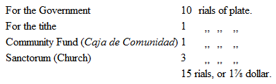The capitation tax, or tribute paid by the natives, is the foundation of the financial system in the Philippines. It is the only direct tax (except for special cases), makes no distinction of persons and property, has the merit of antiquity, and is collected by a machinery provided by the Indians themselves. Originally it was levied in produce, but compounded for by the payment of a dollar (eight reales), raised afterwards to a dollar and a quarter, and finally the friars have managed to add to the amount an additional fifty per cent., of which four-fifths are for church, and one-fifth for commercial purposes.