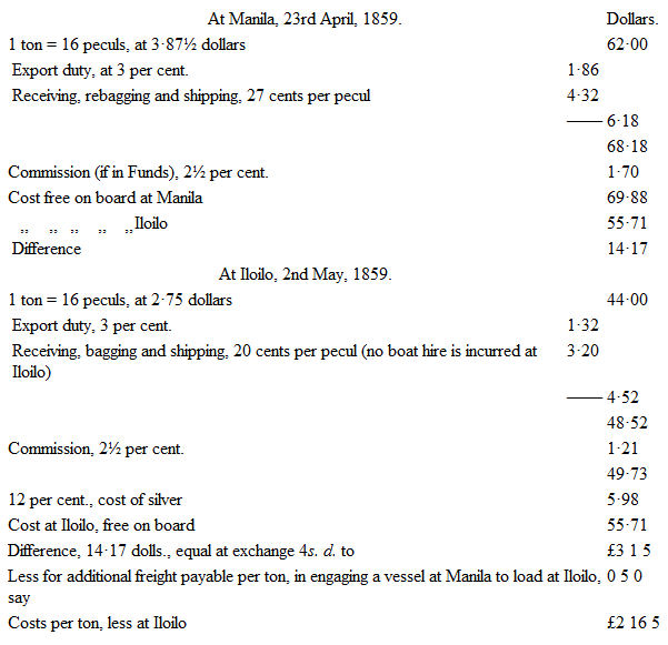 “The difference in the cost of sugar at Iloilo and at Manila is at present 2l. 16s. 5d. per ton, free on board; as will be seen from the following: —