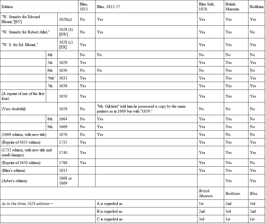 F. Madan, Sub-Librarian Bodleian Library,February 11th, 1897.This table was compiled for me most kindly by Mr. Madan. It answers the question, what editions Bliss knew of at various times.