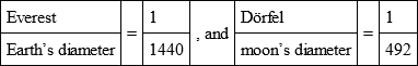 Taking the earth’s diameter at 7912 miles, the moon’s diameter, 2163 miles, and the height of Mount Everest as 29,000 feet, I find that