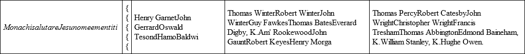 The form of this oath is thus given in the official account: "You shall swear by the blessed Trinity, and by the Sacrament you now propose to receive, never to disclose directly or indirectly, by word or circumstance, the matter that shall be proposed to you to keep secret, nor desist from the execution thereof until the rest shall give you leave." It is a singular circumstance that the form of this oath, which was repeated in official publications, with an emphasis itself inexplicable, occurs in only one of the conspirators' confessions, viz., the oft-quoted declaration of T. Winter, November 23rd, 1605. This – as we shall see, a most suspicious document – was one of the two selected for publication, on which the traditional history of the plot depends. Curiously enough, however, the oath, with sundry other matters, was omitted from the published version of the confession.
