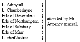 IIRobertus Cecil, Comes Sarisburiensis, summus et regisSecretarius, et Angliæ thesaurarius, clariss' patriset de repub. meritissimi filius, in paterna munerasuccessor longe dignissimus;Henricus, comes Northamptoniæ, quinq. portuum præfectus etprivati sigilli custos, disertorum litteratissimus, litteratorumdisertissimus;Carolus comes Nottingamiæ, magnus Angliæ admirallusvictoriosus;Thomas Suffolciæ comes, regis camerarius splendidissimus,tres viri nobilissimi ex antiqua Howardorum familia, ducumq.Norfolciæ prosapia;Edwardus Somersetus, comes Wigorniæ, equis regiis præfectusornatissimus;Carolus Blunt, comes Devoniæ, Hyberniæ prorex et pacificator,Joannes Areskinus,465 illustris Marriæ comes, præcipuarum in Scotiaarcium præfectus;Georgius Humius, Dunbari comes, Scotiæ thesaurariusprudentiss'omnes illustriss' ordinis garteri milites;Joannes Popham, miles, justiciarius Angliæ capitalis,et justitiæ consultissimus:IIIConjuratorum Nomina, ad perpetuam ipsorum infamiam et tantæ diritatis detestationem sempiternam.