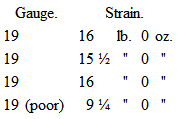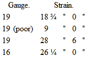 It will be observed that the drops made from green bottle glass withstood a greater strain than those made from crown glass; the latter, in fact, did not break throughout their mass, but left a portion of the bulb unbroken, showing some fault in the tempering. It was with difficulty that the workmen could be induced to make drops out of this kind of glass, as they knew by experience that they usually failed to break perfectly, and they stated that it was quite impossible to make them with lead glass. To ascertain what force was required to fracture a thread of like dimensions that had not been tempered, one of the drops was heated to redness, and annealed by allowing it to cool very gradually. When subjected to the same trial, it was fractured by a weight of 12 ozs., and the drop did not break into small fragments, but behaved exactly like ordinary glass, thus showing that the glass had been untempered by the heating process. A piece of glass rod, drawn out into a thread in a gas flame, when subjected to the same conditions, bore a strain of 10 oz. A sewing-needle of the same thickness was broken by a weight of 3 lb. 14 oz., thus showing that the tail of the Rupert's drop was very much manner as to allow the tail to dip into hydrofluoric acid, it is found, that when the surface or skin is eaten away to a certain depth,