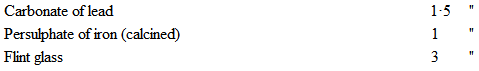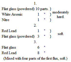It has been suggested to me, that I should give some receipts for the manufacture of the enamel colours used in mediæval glass painting; I have therefore added a few which are easily prepared. Others of a more complicated nature had much better be obtained from the makers of the enamel used in porcelain painting. And here again, let me remark, that in ordering fluxes from these manufacturers, it should be stated especially that a flux is required which does not contain borax, nor should the painters in any establishment be allowed to use these softer fluxes, which they are almost certain to do, unless forbidden; for though they are easier to work with, they will infallibly lead to calamitous results.