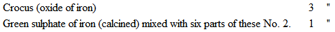 From this description it will be seen, that the various colours in the different parts of the window are put in as pieces, and that no colours, properly so called, are applied by the brush to the surface. There are, however, certain tints of the "tracing brown," which can be obtained by the addition of black oxide of manganese, or by a different method of preparation of the oxide of iron, to give it its body. Sulphate of iron, when heated, loses its sulphuric acid, and the oxide, which was, as sulphate, in the state of protoxide, becomes, by heating, the red or peroxide of iron; its tint, when made in this way, being generally lighter than the tint of that form of oxide which is employed as ordinary tracing brown. It is sometimes called flesh tint, though this is decidedly an objectionable name for it.