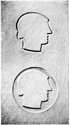 164. But for fine sculpture, we must advance by far other methods. If we carve the subject with real delicacy, the cast shadow of the incision will interfere with its outline, so that, for representation of beautiful things you must clear away the ground about it, at all events for a little distance. As the law of work is to use the least pains possible, you clear it only just as far back as you need, and then, for the sake of order and finish, you give the space a geometrical outline. By taking, in this case, the simplest I can,—a circle,—I can clear the head with little labor in the removal of surface round it; (see the lower figure in Plate XI.)