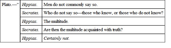 The answer is put into the mouth of the sophist; but put as an established fact, which he cannot possibly deny. [Plato: Hippias Major, 284 E. Steph.].