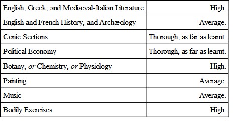 I should require, for a first class, proficiency in two schools; not, of course, in all the subjects of each chosen school, but in a well-chosen and combined group of them. Thus, I should call a very good first-class man one who had got some such range of subjects, and such proficiency in each, as this: