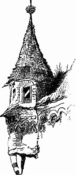 Many of us are familiar with the ordinary form of the Italian bell-tower or campanile. From the eighth century to the thirteenth there was little change in that form:8 four-square, rising high and without tapering into the air, story above story, they stood like giants in the quiet fields beside the piles of the basilica or the Lombardic church, in this form (fig. 9), tiled at the top in a flat gable, with open arches below, and fewer and fewer arches on each inferior story, down to the bottom. It is worth while noting the difference in form between these and the towers built for military service. The latter were built as in fig. 10, projecting vigorously at the top over a series of brackets or machicolations, with very small windows, and no decoration below. Such towers as these were attached to every important palace in the cities of Italy, and stood in great circles—troops of towers—around their external walls: their ruins still frown along the crests of every promontory of the Apennines, and are seen from far away in the great Lombardic plain, from distances of half-a-day's journey, dark against the amber sky of the horizon. These are of course now built no more, the changed methods of modern warfare having cast them into entire disuse; but the belfry or campanile has had a very different influence on European architecture. Its form in the plains of Italy and South France being that just shown you, the moment we enter the valleys of the Alps, where there is snow to be sustained, we find its form of roof altered by the substitution of a steep gable for a flat one.9 There are probably few in the room who have not been in some parts of South Switzerland, and who do not remember the beautiful effect of the gray mountain churches, many of them hardly changed since the tenth and eleventh centuries, whose pointed towers stand up through the green level of the vines, or crown the jutting rocks that border the valley.