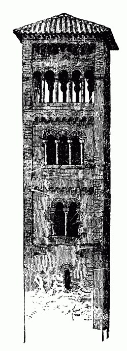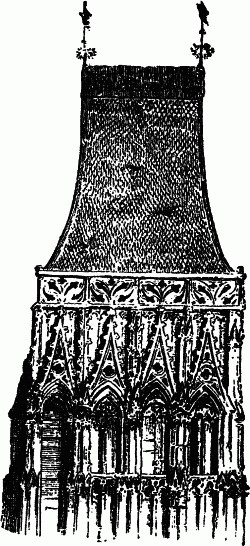 21. From this form to the true spire the change is slight, and consists in little more than various decoration; generally in putting small pinnacles at the angles, and piercing the central pyramid with traceried windows; sometimes, as at Fribourg and Burgos, throwing it into tracery altogether: but to do this is invariably the sign of a vicious style, as it takes away from the spire its character of a true roof, and turns it nearly into an ornamental excrescence. At Antwerp and Brussels, the celebrated towers (one, observe, ecclesiastical, being the tower of the cathedral, and the other secular), are formed by successions of diminishing towers, set one above the other, and each supported by buttresses thrown to the angles of the one beneath. At the English cathedrals of Lichfield and Salisbury, the spire is seen in great purity, only decorated by sculpture; but I am aware of no example so striking in its entire simplicity as that of the towers of the cathedral of Coutances in Normandy. There is a dispute between French and English antiquaries as to the date of the building, the English being unwilling to admit its complete priority to all their own Gothic. I have no doubt of this priority myself; and I hope that the time will soon come when men will cease to confound vanity with patriotism, and will think the honor of their nation more advanced by their own sincerity and courtesy, than by claims, however learnedly contested, to the invention of pinnacles and arches. I believe the French nation was, in the twelfth and thirteenth centuries, the greatest in the world; and that the French not only invented Gothic architecture, but carried it to a perfection which no other nation has approached, then or since: but, however this may be, there can be no doubt that the towers of Coutances, if not the earliest, are among the very earliest, examples of the fully developed spire. I have drawn one of them carefully for you (fig. 11), and you will see immediately that they are literally domestic roofs, with garret windows, executed on a large scale, and in stone. Their only ornament is a kind of scaly mail, which is nothing more than the copying in stone of the common wooden shingles of the house-roof; and their security is provided for by strong gabled dormer windows, of massy masonry, which, though supported on detached shafts, have weight enough completely to balance the lateral thrusts of the spires. Nothing can surpass the boldness or the simplicity of the plan; and yet, in spite of this simplicity, the clear detaching of the shafts from the slope of the spire, and their great height, strengthened by rude cross-bars of stone, carried back to the wall behind, occasion so great a complexity and play of cast shadows, that I remember no architectural composition of which the aspect is so completely varied at different hours of the day.10 But the main thing I wish you to observe is, the complete domesticity of the work; the evident treatment of the church spire merely as a magnified house-roof; and the proof herein of the great truth of which I have been endeavoring to persuade you, that all good architecture rises out of good and simple domestic work; and that, therefore, before you attempt to build great churches and palaces, you must build good house doors and garret windows.