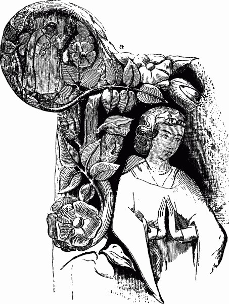 37. Now, the Gothic builders placed their decoration on a precisely contrary principle, and on the only rational principle. All their best and most delicate work they put on the foundation of the building, close to the spectator, and on the upper parts of the walls they put ornaments large, bold, and capable of being plainly seen at the necessary distance. A single example will enable you to understand this method of adaptation perfectly. The lower part of the façade of the cathedral of Lyons, built either late in the thirteenth or early in the fourteenth century, is decorated with a series of niches, filled by statues of considerable size, which are supported upon pedestals within about eight feet of the ground. In general, pedestals of this kind are supported on some projecting portion of the basement; but at Lyons, owing to other arrangements of the architecture into which I have no time to enter, they are merely projecting tablets, or flat-bottomed brackets of stone, projecting from the wall. Each bracket is about a foot and a half square, and is shaped thus (fig. 13), showing to the spectator, as he walks beneath, the flat bottom of each bracket, quite in the shade, but within a couple of feet of the eye, and lighted by the reflected light from the pavement. The whole of the surface of the wall round the great entrance is covered with bas-relief, as a matter of course; but the architect appears to have been jealous of the smallest space which was well within the range of sight; and the bottom of every bracket is decorated also—nor that slightly, but decorated with no fewer than six figures each, besides a flower border, in a space, as I said, not quite a foot and a half square. The shape of the field to be decorated being a kind of quatre-foil, as shown in fig. 13, four small figures are placed, one in each foil, and two larger ones in the center. I had only time, in passing through the town, to make a drawing of one of the angles of these pedestals; that sketch I have enlarged, in order that you may have some idea of the character of the sculpture. Here is the enlargement of it (fig. 15). Now observe, this is one of the angles of the bottom of a pedestal, not two feet broad, on the outside of a Gothic building; it contains only one of the four little figures which form those angles; and it shows you the head only of one of the larger figures in the center. Yet just observe how much design, how much wonderful composition, there is in this mere fragment of a building of the great times; a fragment, literally no larger than a school-boy could strike off in wantonness with a stick: and yet I cannot tell you how much care has been spent—not so much on the execution, for it does not take much trouble to execute well on so small a scale—but on the design, of this minute fragment. You see it is composed of a branch of wild roses, which switches round at the angle, embracing the minute figure of the bishop, and terminates in a spray reaching nearly to the head of the large figure. You will observe how beautifully that figure is thus pointed to by the spray of rose, and how all the leaves around it in the same manner are subservient to the grace of its action. Look, if I hide one line, or one rosebud, how the whole is injured, and how much there is to study in the detail of it. Look at this little diamond crown, with a lock of the hair escaping from beneath it; and at the beautiful way in which the tiny leaf at a, is set in the angle to prevent its harshness; and having examined this well, consider what a treasure of thought there is in a cathedral front, a hundred feet wide, every inch of which is wrought with sculpture like this! And every front of our thirteenth century cathedrals is inwrought with sculpture of this quality! And yet you quietly allow yourselves to be told that the men who thus wrought were barbarians, and that your architects are wiser and better in covering your walls with sculpture of this kind (fig. 14, Plate VIII.)