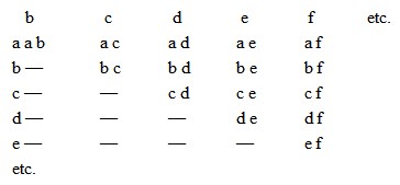 163. This discussion of the relative merits of transparent and opaque color has, however, led us a little beyond the point where we should have begun; we must go back to our palette, if you please. Get a cake of each of the hard colors named in the note below47 and try experiments on their simple combinations, by mixing each color with every other. If you like to do it in an orderly way, you may prepare a squared piece of pasteboard, and put the pure colors in columns at the top and side; the mixed tints being given at the intersections, thus (the letters standing for colors):