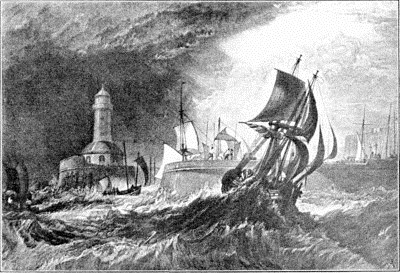 This, though less attractive, at first sight, than the former plate, is a better example of the master, and far truer and nobler as a piece of thought. The lifting of the brig on the wave is very daring; just one of the things which is seen in every gale, but which no other painter than Turner ever represented; and the lurid transparency of the dark sky, and wild expression of wind in the fluttering of the falling sails of the vessel running into the harbor, are as fine as anything of the kind he has done. There is great grace in the drawing of this latter vessel: note the delicate switch forward of her upper mast.