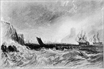 I look upon this as one of the noblest sea-pieces which Turner ever produced. It has not his usual fault of over-crowding or over-glitter; the objects in it are few and noble, and the space infinite. The sky is quite one of his best: not violently black, but full of gloom and power; the complicated roundings of its volumes behind the sloop's mast, and downwards to the left, have been rendered by the engraver with notable success; and the dim light entering along the horizon, full of rain, behind the ship of war, is true and grand in the highest degree. By comparing it with the extreme darkness of the skies in the Plymouth, Dover, and Ramsgate, the reader will see how much more majesty there is in moderation than in extravagance, and how much more darkness, as far as sky is concerned, there is in gray than in black. It is not that the Plymouth and Dover skies are false,—such impenetrable forms of thunder-cloud are amongst the commonest phenomena of storm; but they have more of spent flash and past shower in them than the less passionate, but more truly stormy and threatening, volumes of the sky here. The Plymouth storm will very thoroughly wet the sails, and wash the decks, of the ships at anchor, but will send nothing to the bottom. For these pale and lurid masses, there is no saying what evil they may have in their thoughts, or what they may have to answer for before night. The ship of war in the distance is one of many instances of Turner's dislike to draw complete rigging; and this not only because he chose to give an idea of his ships having seen rough service, and being crippled; but also because in men-of-war he liked the mass of the hull to be increased in apparent weight and size by want of upper spars. All artists of any rank share this last feeling. Stanfield never makes a careful study of a hull without shaking some or all of its masts out of it first, if possible. See, in the Coast Scenery, Portsmouth harbor, Falmouth, Hamoaze, and Rye old harbors; and compare, among Turner's works, the near hulls in the Devonport, Saltash, and Castle Upnor, and distance of Gosport. The fact is, partly that the precision of line in the complete spars of a man-of-war is too formal to come well into pictorial arrangements, and partly that the chief glory of a ship of the line is in its aspect of being "one that hath had losses."