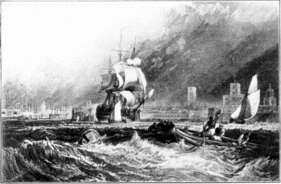 It is also a very curious instance of that habit of Turner's before referred to (p. {ref}27), of never painting a ship quite in good order. On showing this plate the other day to a naval officer, he complained of it, first that "the jib21 would not be wanted with the wind blowing out of harbor," and, secondly, that "a man-of-war would never have her foretop-gallant sail set, and her main and mizzen top-gallants furled:—all the men would be on the yards at once."