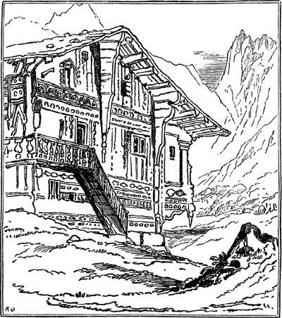 40. The life of a Swiss peasant is divided into two periods; that in which he is watching his cattle at their summer pasture on the high Alps,5 and that in which he seeks shelter from the violence of the winter storms in the most retired parts of the low valleys. During the first period, he requires only occasional shelter from storms of excessive violence; during the latter, a sufficient protection from continued inclement weather. The Alpine or summer cottage, therefore, is a rude log hut, formed of unsquared pine trunks, notched into each other at the corners. The roof being excessively flat, so as to offer no surface to the wind, is covered with fragments of any stone that will split easily, held on by crossing logs; which are in their turn kept down by masses of stone; the whole being generally sheltered behind some protecting rock, or resting against the slope of the mountain, so that, from one side, you may step upon the roof. That is the châlet. When well grouped, running along a slope of mountain side, these huts produce a very pleasing effect, being never obtrusive (owing to the prevailing grayness of their tone), uniting well with surrounding objects, and bestowing at once animation and character.
