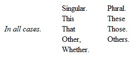 Therefore and wherefore, which are properly there for and where for, for that, for which, are now reckoned conjunctions, and continued in use. The rest seem to be passing by degrees into neglect, though proper, useful, and analogous. They are referred both to singular and plural antecedents.