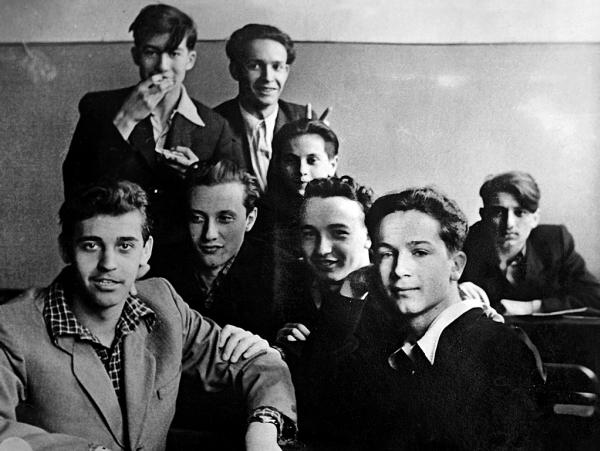 Школа № 50, 9-й «Б» (1953). Сидят (слева направо) Миша Ройтштейн, Володя Джинчарадзе, Лавренов, Андрюша Ильенко. Сзади стоят Жолковский, Гололобов, Ковтун (?), сидит Эдик Абрамов