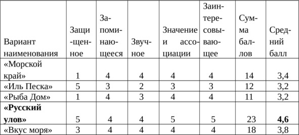 Оцените каждое название по пятибалльной системе (5 – соответствует полностью / 1 – не соответствует полностью). Данные оценки названия по этим пяти критериям вносятся в таблицу, после чего вычисляется средний балл. Название, получившее наибольший балл, можно внедрять и использовать.