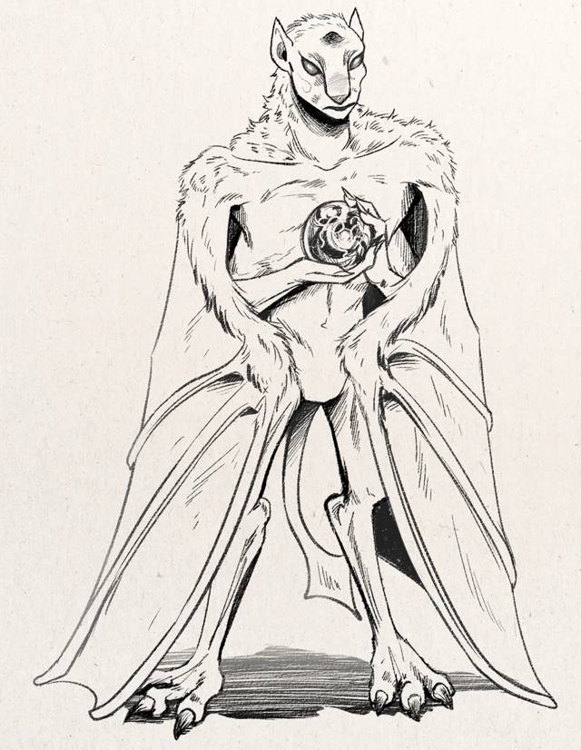 Большие раскосые глаза, широкий нос, сужающийся книзу, выступающий подбородок, сжатый и как будто ороговевший рот. По бокам головы, словно впалые щеки, тянулись ямочки, переходя в заострённые уши. На лбу роговатый вырост, такой же, как у всех шестилапов. Сзади что-то похожее на крылья, которые, будто плащом, окутали плечи. Чуть ниже руки, и в них существо держало предмет, круглый, гладкий, переливающийся всеми цветами пылающих небес.