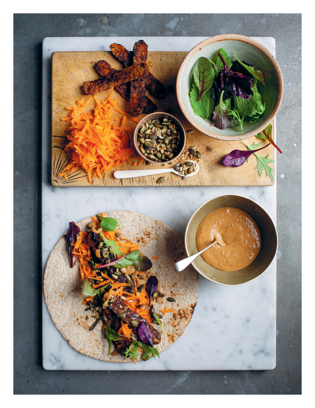 This wrap sustained me through a week in the desert, listening to music, a few years ago. Just the right combination of refreshing greens and vitamin-loaded carrot and good protein energy from tempeh and seeds.