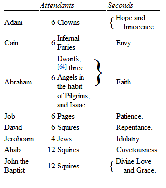 “At five in the afternoon, the Marshal, attended by his Adjutant, presented himself in the lists. He was followed by four children, in the dress used to represent angels, with lighted torches in their hands. Another child, personating Michael the Archangel, was the leader of a second group of six angels, who were the bearers of the prizes—a Lamb and a Male Infant. The Judges, Justice and Mercy, appeared last of all, and took their appointed seats.