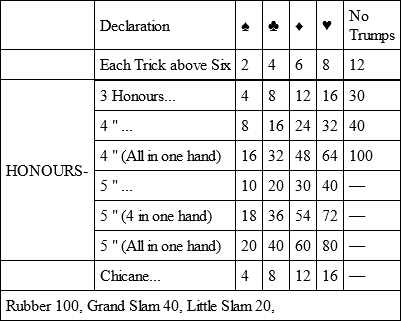 Each trick above six counts two points when spades are trumps, four points when clubs are trumps, six points when diamonds are trumps, eight points when hearts are trumps, and twelve points when there are no trumps.