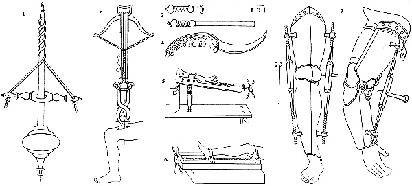 The technique of some of these old surgeons is a never-ending source for surprise. The exaggerated Trendelenburg position in the operation for the radical cure of hernia—the patient being fastened on an inclined board, head down, so that the intestines would fall away from the site of operation—was used by Guy de Chauliac, who probably obtained a hint of it from Italy. He also employed extension in the treatment of fracture of the thigh, inventing an apparatus by which this might be continued for a long time until the muscles were relaxed from overtiredness. He made use for this purpose of a weight suspended on a cord which ran over rollers. He also adapted stiffened bandages of various kinds, especially employing white of egg for this, and sometimes moulding bandages to the limbs in cases of fracture. Yperman, the Flemish surgeon of this time, knew and used the œsophagus tube for artificial feeding, and a number of various kinds of instruments were invented for the urethra, including bougies of wax, tin, and silver. In diseases of the bladder and in gonorrhœa John Ardern employed astringent injections.