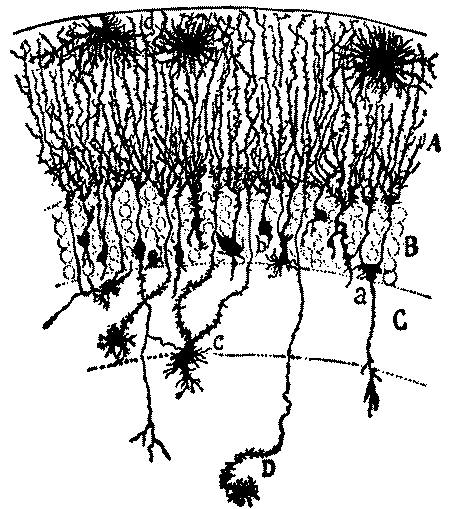 To put it all in a few words, the neuroglia cells of the gray substance of the brain represent an insulating and switching apparatus for nerve currents. They are an insulation apparatus when in a state of contraction, a switching and insulating apparatus when in a state of rest. It is to be remarked, then, that according to this theory the contraction of brain cells does not take place, as in Duval's theory, during intellectual rest, but, on the contrary, during the state of activity of the cerebral cortex. It is much more probable that the action of cells coincides with the active stage of intellection than that brain cellular activity—that is, contraction—should correspond with psychic rest.