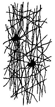 The neuroglia cells of the gray matter present a very special and highly characteristic appearance. They are of manifold form,—at times star-shaped, at times like a comet drawn out in length. These are the tall cells of von Retzius. They have very numerous prolongations, with a large number of short branched collaterals which give the whole cell the appearance of having feathers projecting from its periphery. These cells have been observed in two different conditions. One is that of relaxation, and the picture is that given above. The other is that of contraction, during which the cell body has more protoplasm in it, and the processes become shorter and thicker, and some of the secondary branches disappear entirely. These cells resemble, in certain ways at least, the pigment cells which occur in the skin of some animals. By means of their contractility, these pigment cells can stretch out their processes while in a state of contraction. It must be remembered that this form of neuroglia cells is most abundantly present in those parts of the brain in which it might be expected that a number of nerve currents would frequently come together. They occur, for example, with special frequency in the molecular layer of the cerebral cortex, where the bundle of pyramidal fibers, with their immense number of terminal nerve-endings, come in contact with one another.