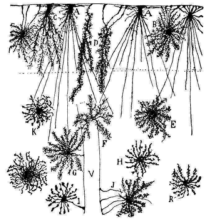 FIG. 19.—NEUROGLIA CELLS OF THE SUPERFICIAL LAYERS OF THE BRAIN FROM AN INFANT AGED TWO MONTHS (method of Golgi). A, B, C, D, neuroglia cells of the plexiform layer; E, F, G, H, K, R, neuroglia cells of the second and third layers; I, J, neuroglia cells with vascular pedicles; V, blood-vessel. (Ramon j Cajal.)